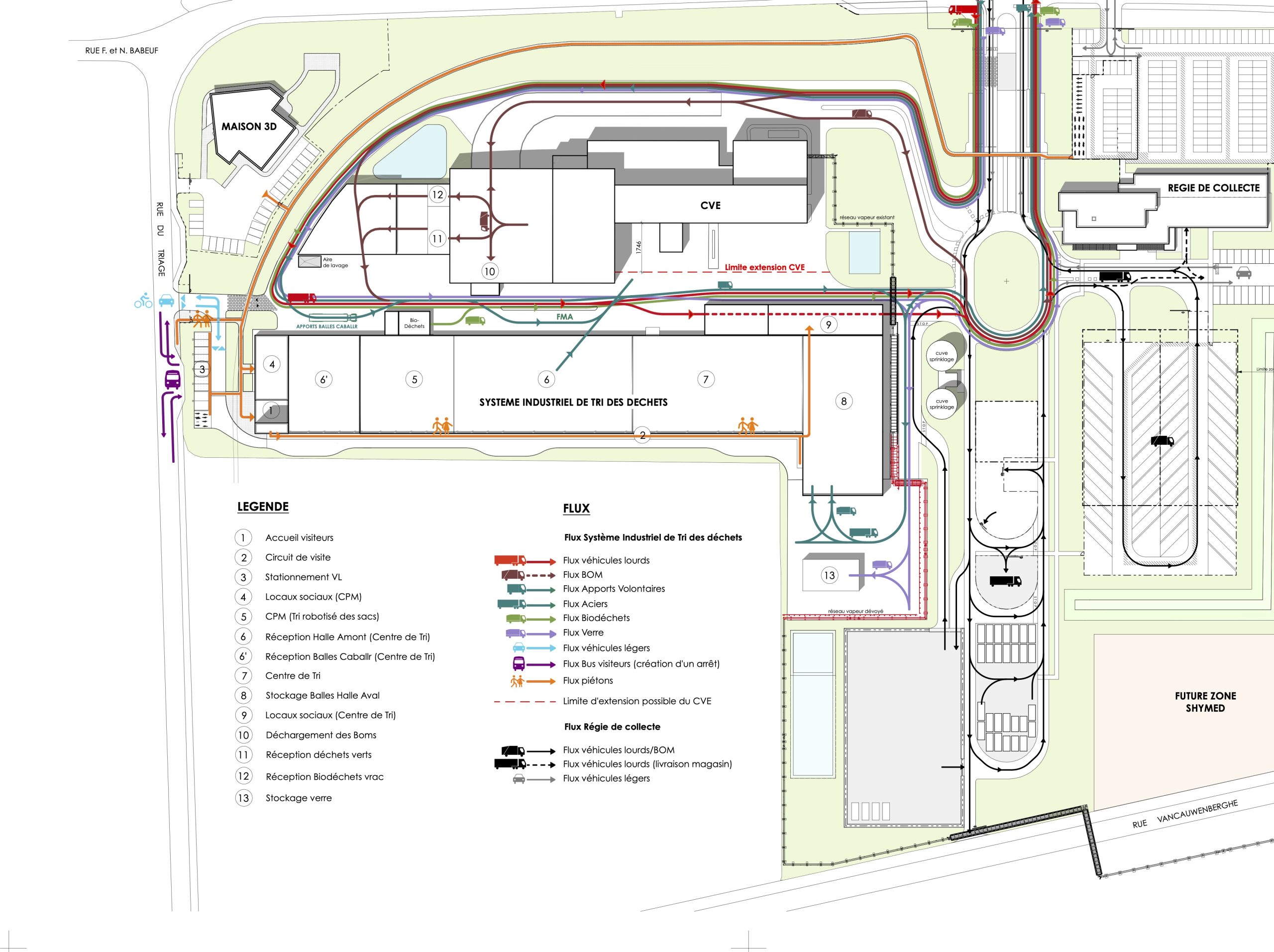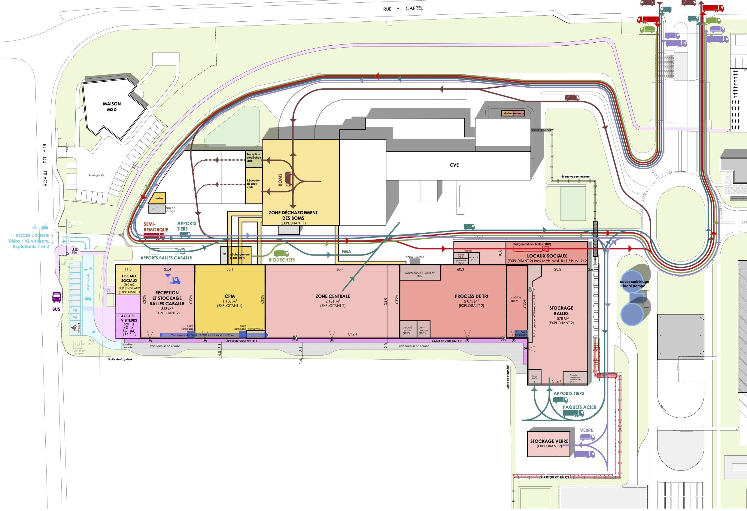 Notre projet propose de combiner une organisation fonctionnelle claire et rigoureuse avec une démarche environnementale globale. S’appuyant sur l’organisation générale du site, la fonctionnalité du projet repose sur la constitution d’une boucle de desserte permettant de séparer les différents flux entrant-sortant.
