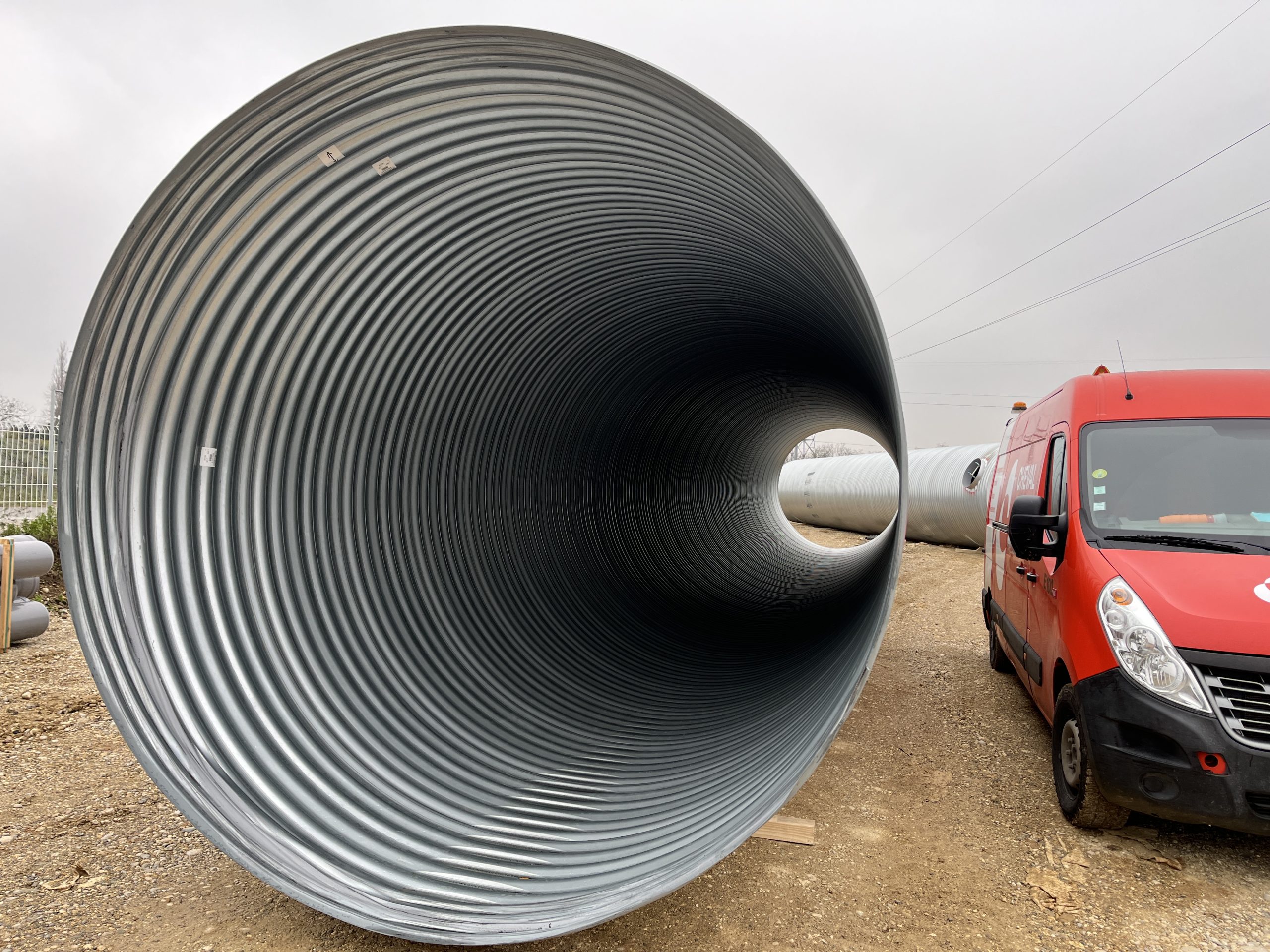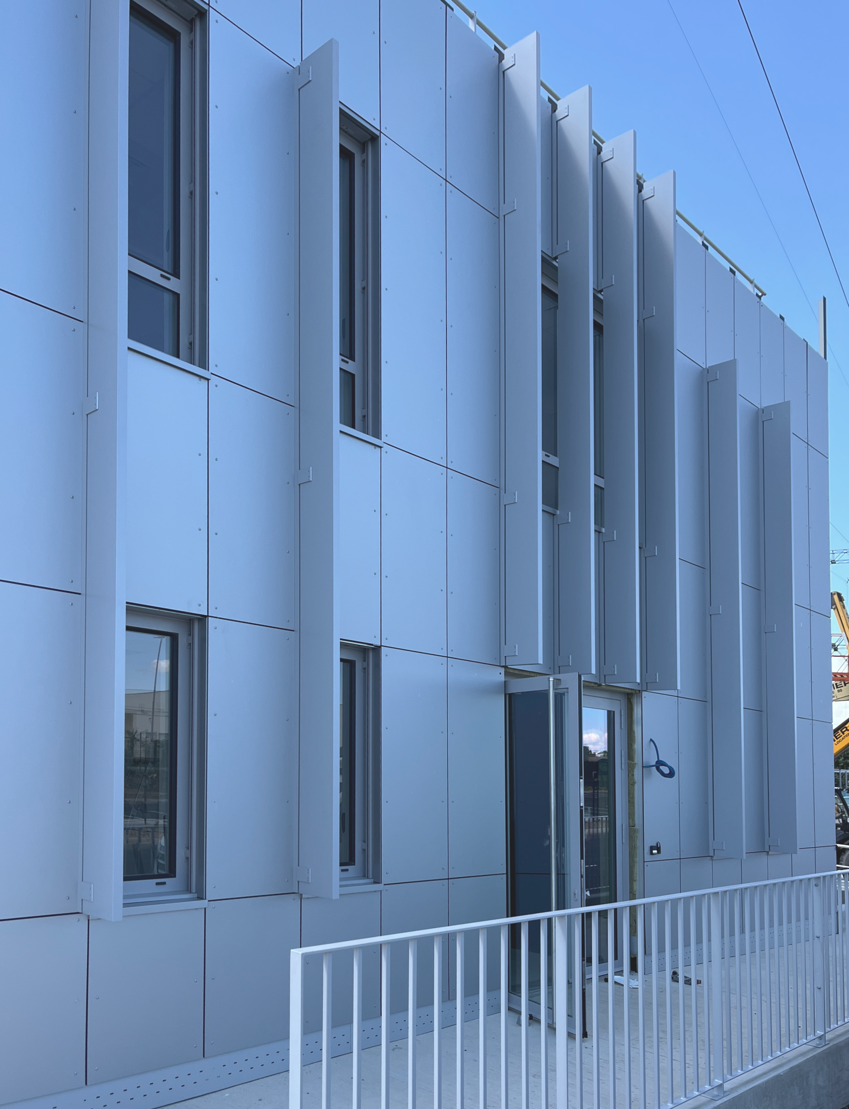 Toutes les façades de l’entrepôt sont recouvertes d’un bardage métallique nervuré à pose verticale. Sur la façade Est est implanté un bloc-bureau s’étageant sur 2 niveaux.