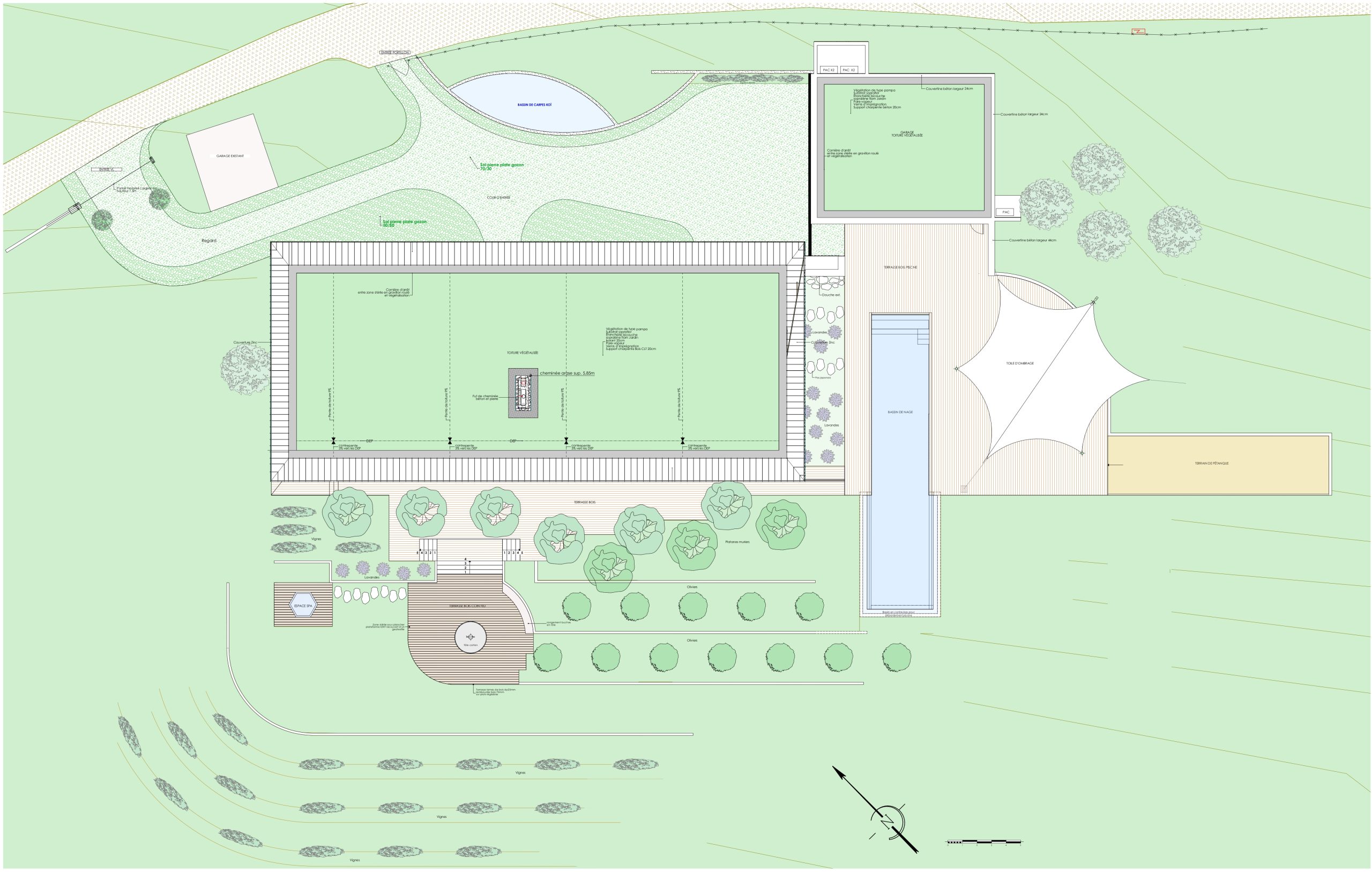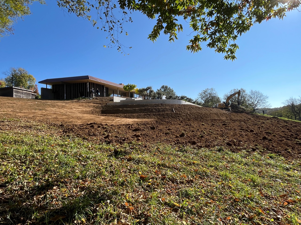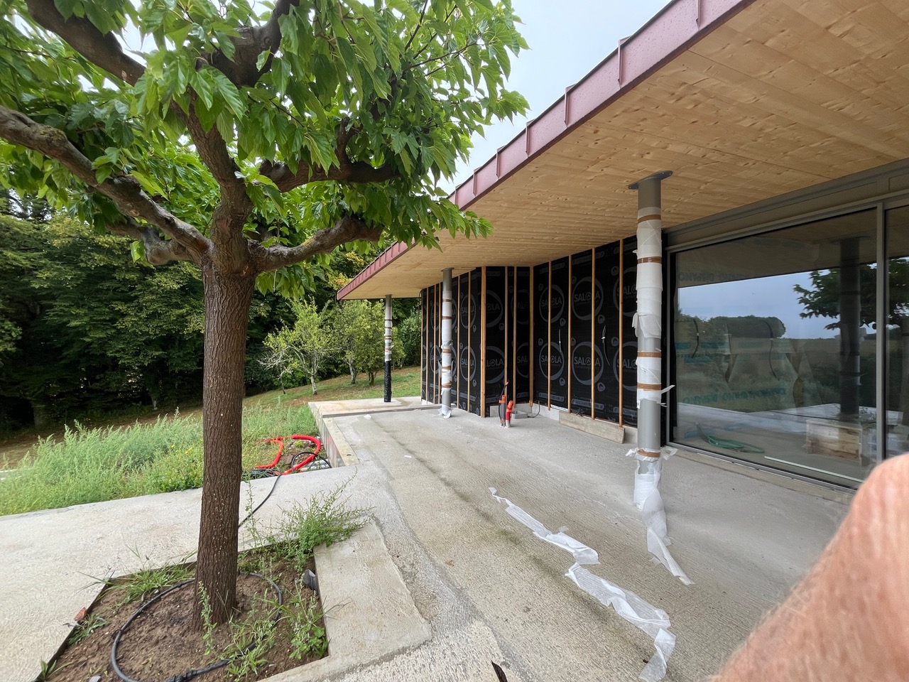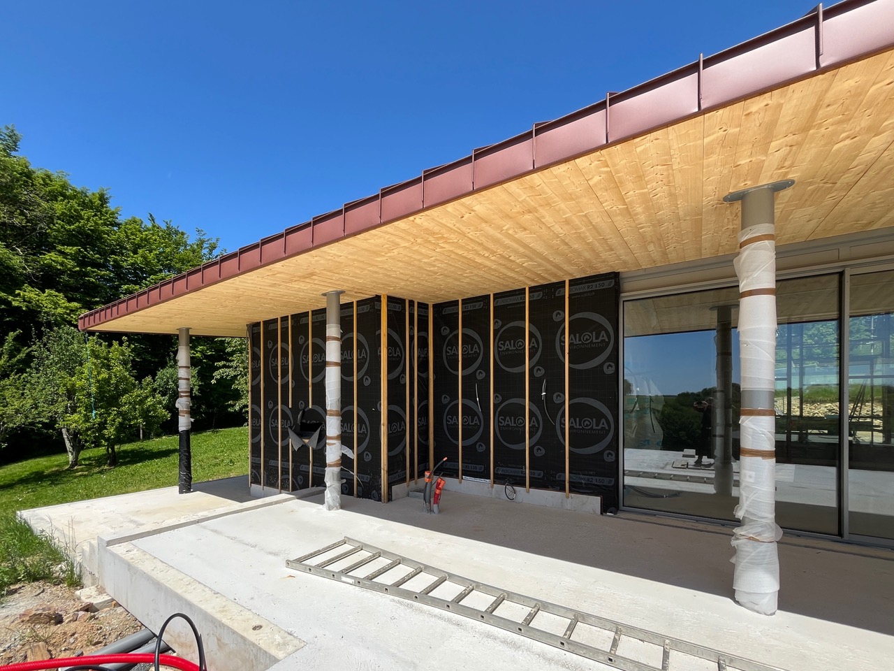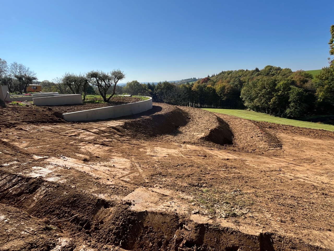 La façade d’entrée en pierre de pays permet par deux percements principaux de profiter d’un volume traversant et de la lumière du levant. De l’autre côté, bénéficiant de l’orientation et de la vue offerte par la pente descendante du site, la façade Sud-Ouest est largement ouverte au profit des espaces de vies offrant une parfaite corrélation entre l’intérieur et l’extérieur. De plus, la terrasse permet l’implantation d’un bassin de nage.