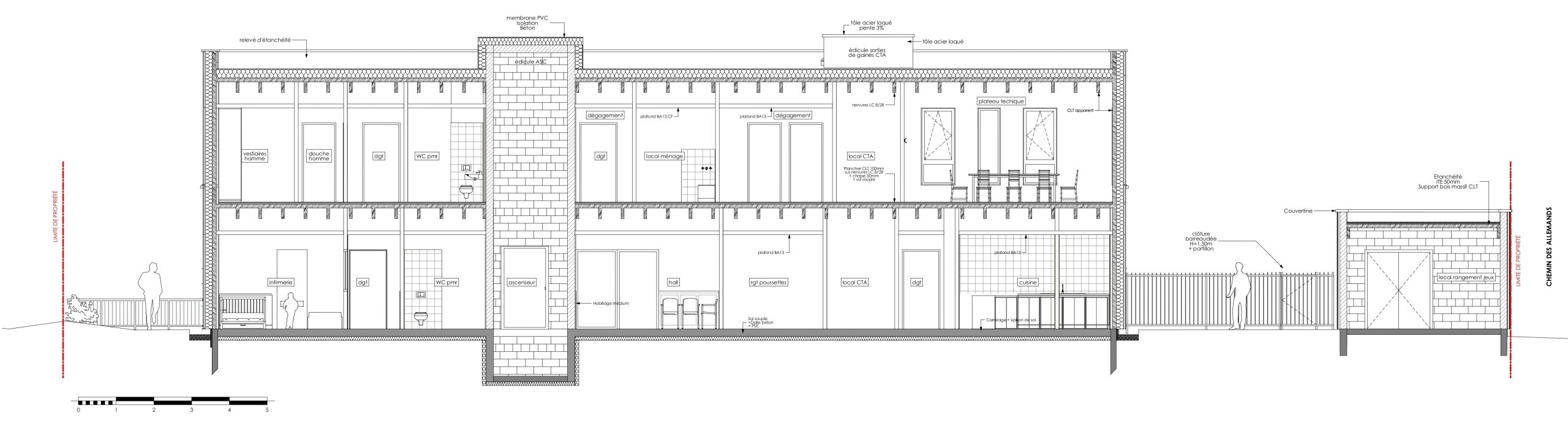 L’établissement accueille également à l’étage des bureaux pour le personnel encadrant, un plateau technique et un atelier afin d’organiser des formations, des locaux techniques et sociaux.