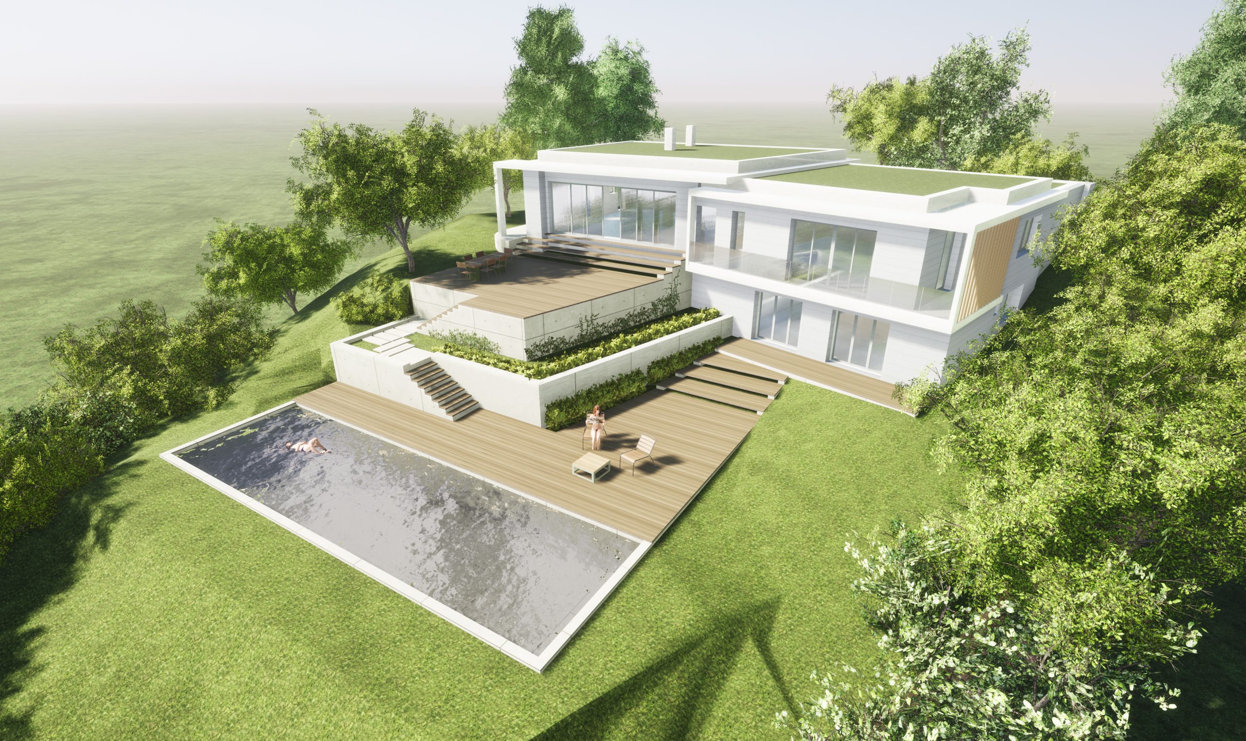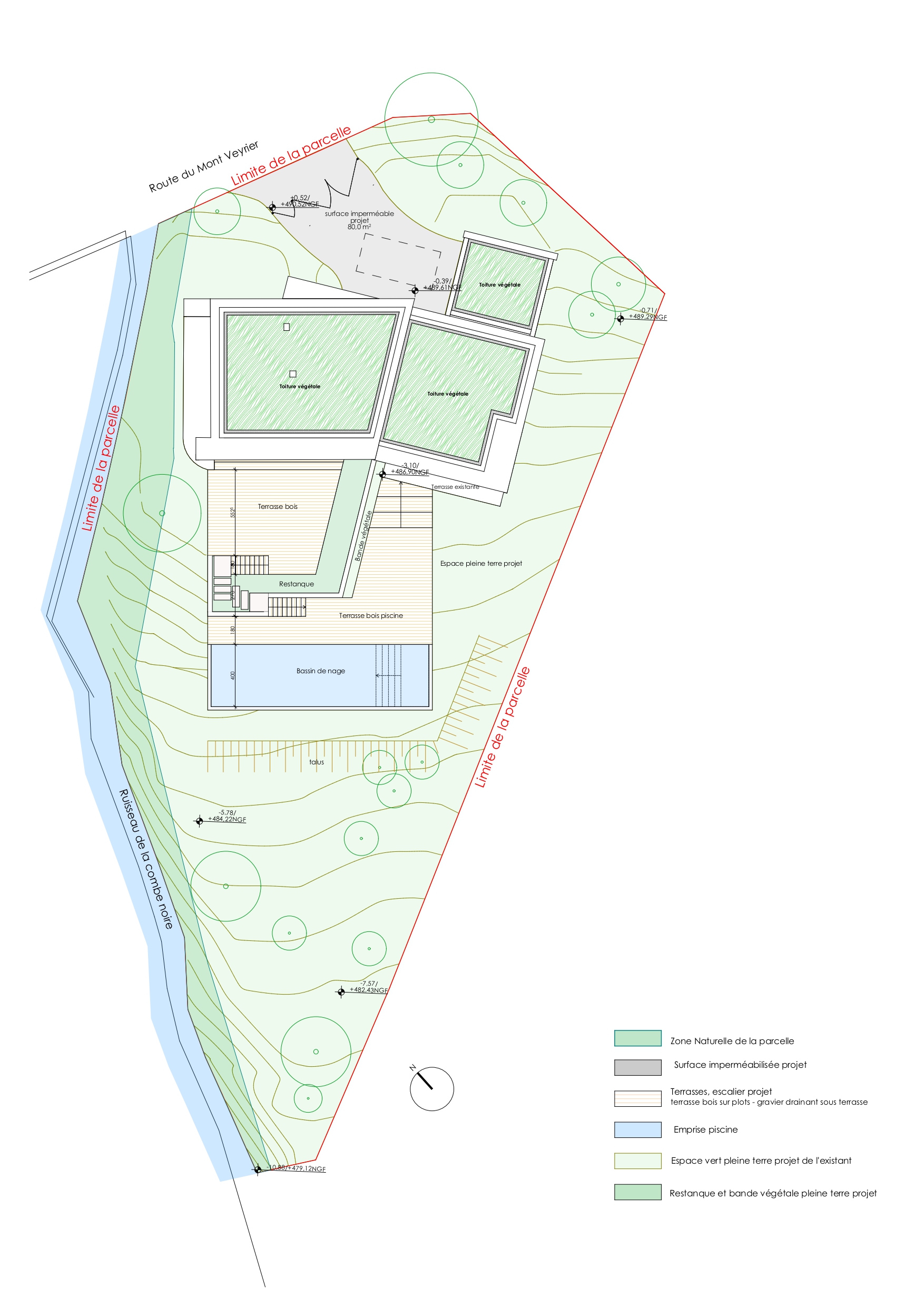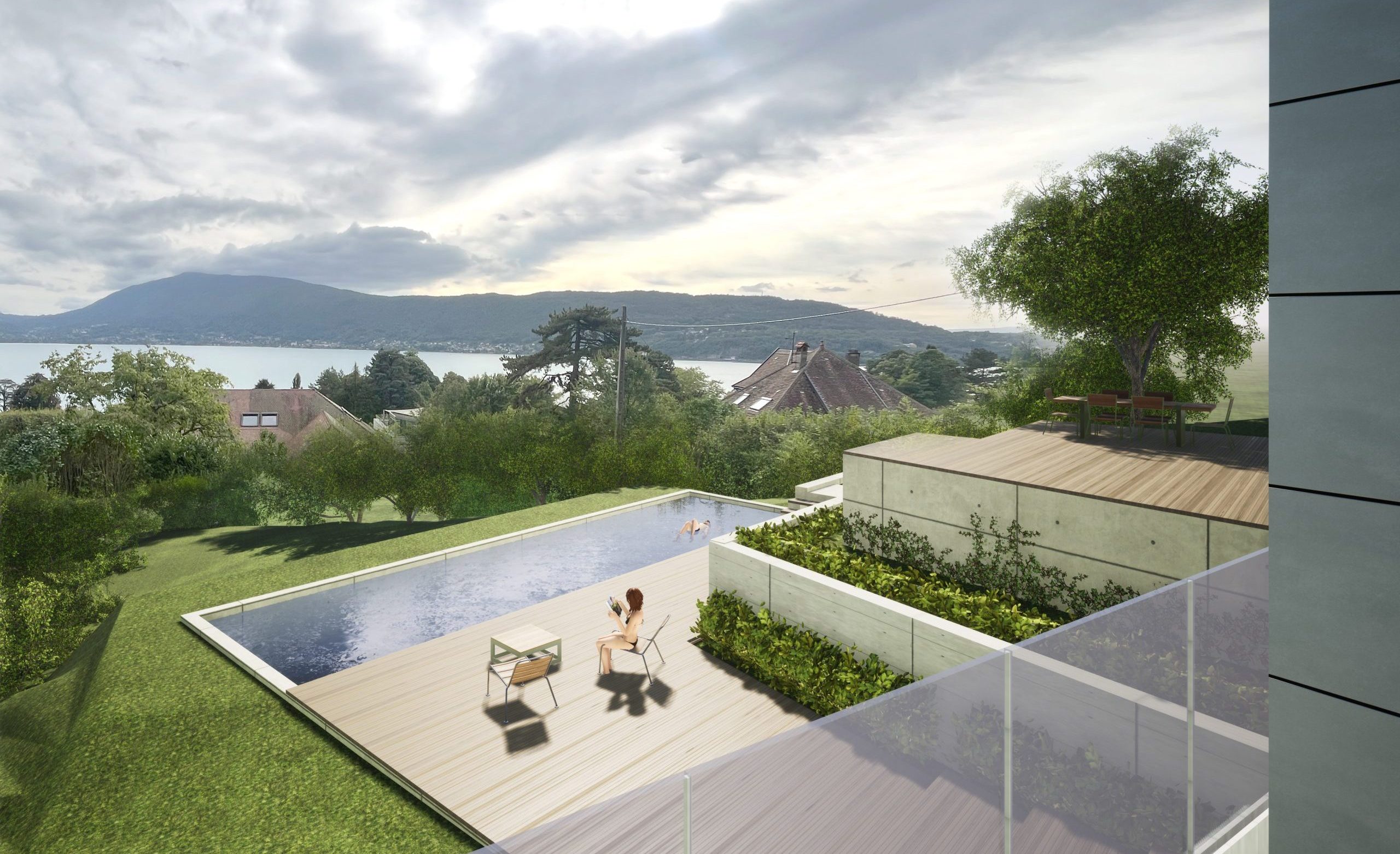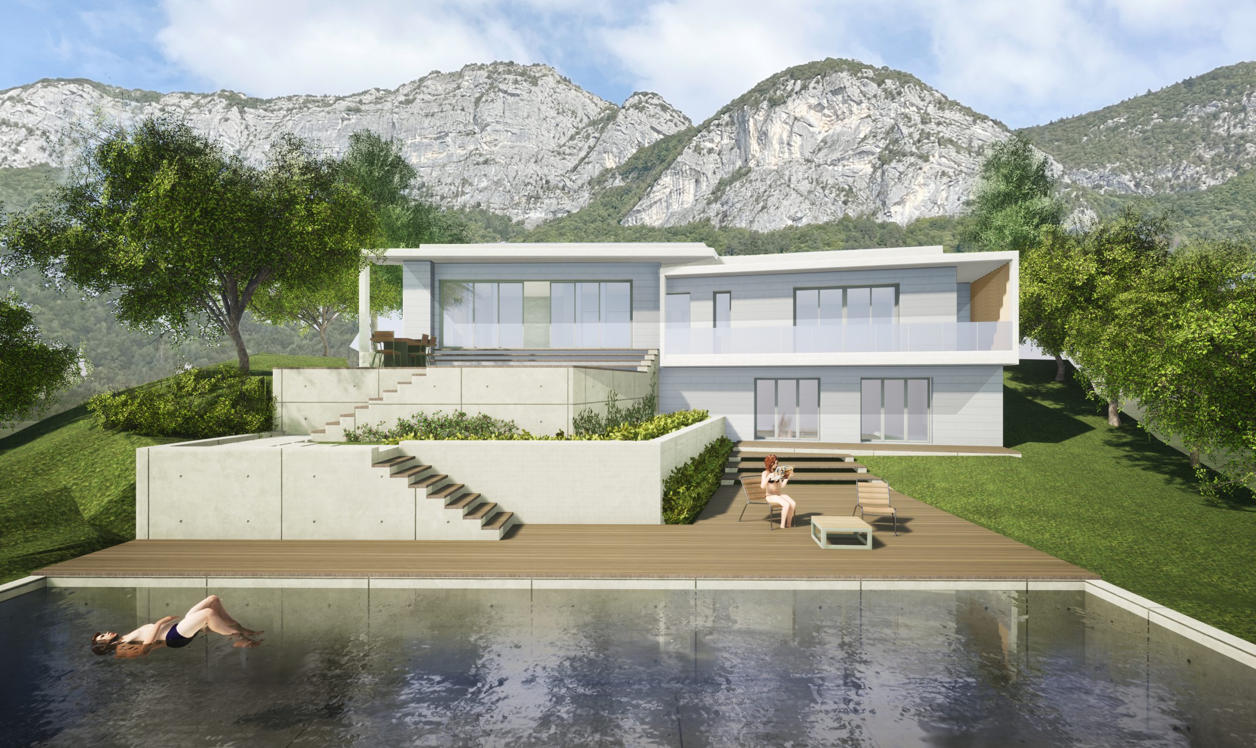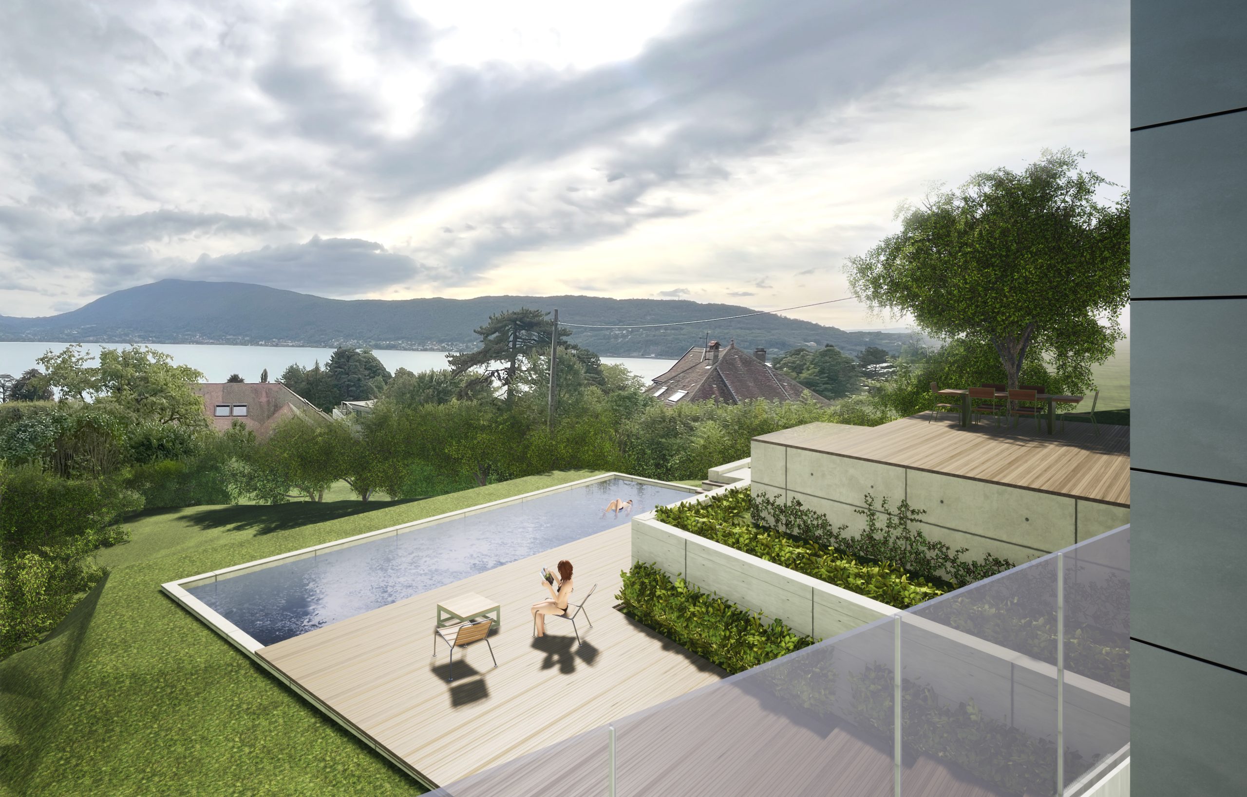Pour finir, le terrain est remodelé pour permettre la mise en place de terrasses bois sur 3 niveaux, soutenues par des restantes en pierre de pays et se terminant par un bassin de nage.