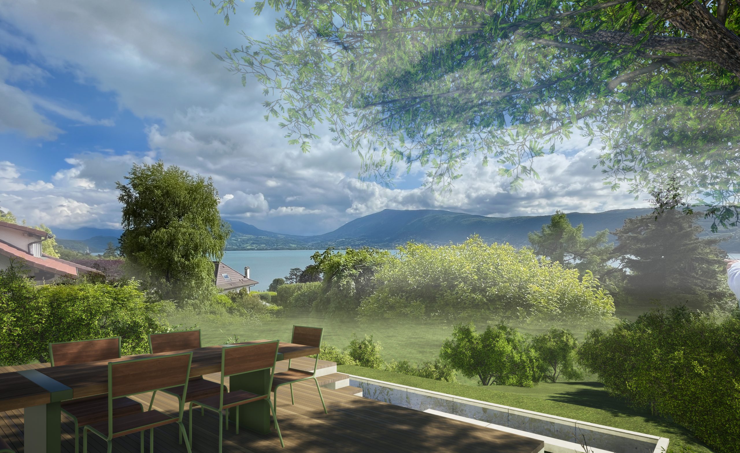 D’une part, les aménagements intérieurs sont revus pour une meilleure ergonomie; de larges baies vitrées offrent une vue sur le lac.
